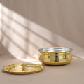 You know that feeling when you find a piece of cookware that just feels right in your hands? That's exactly what this beautiful handcrafted brass handi delivers. Made from pure brass (pital/peetal) with that gorgeous hammered finish that makes every piece unique, this brass cooking pot (also called a handi pot) brings authentic Indian cooking into your modern kitchen. Those dual handles make it so easy to move around, and the fitted lid locks in all those incredible flavors you're building. What really makes this Indian cookware special is how versatile it is - perfect for slow cooking rich curries, aromatic biryani, hearty stews, dal, or even rice dishes. The tin-coated interior (kalai coating) keeps everything completely safe and non-toxic, while the natural heat conductivity of brass gives you that even cooking that preserves every bit of nutrition in your food. There's something deeply satisfying about cooking with traditional cookware that follows Ayurvedic principles - it's like connecting with generations of home cooks who knew the secrets of truly nourishing meals. This brass handi isn't just another pot; it's the kind of kitchen heirloom that becomes part of your family's story, making it an incredibly thoughtful housewarming gift for anyone who appreciates authentic brass cookware and healthy cooking.